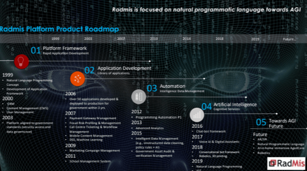 Radmis is focused on its future vision to be leader in software development automation platforms enabled through natural language processing that allows users to make software development requests to Radmis AI who will intelligently and automatically build prototypes and iterate based on user requests. The ultimate goal is to achieve Plain English Software Development Language AI services.